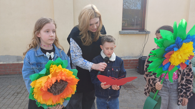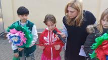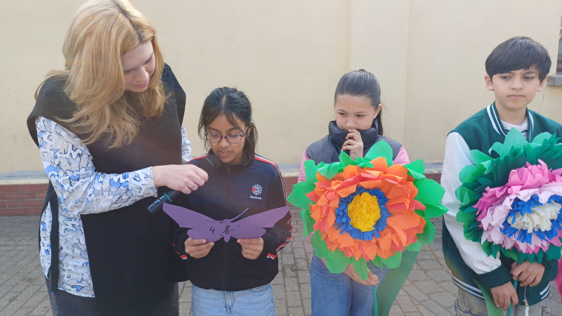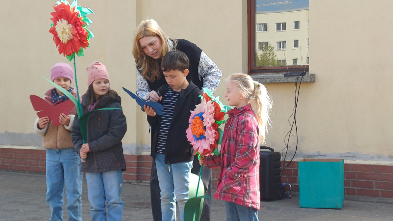 Als Geschenk überreichte jede Klasse eine große, selbstgebastelte Blume, liebevoll gestaltet, bunt verziert und mit einem ganz persönlichen Wunsch für unsere Schule versehen.