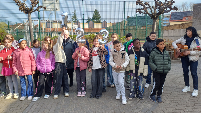 Alle Kinder und Lehrkräfte versammelten sich anschließend auf dem Schulhof, um gemeinsam zu singen. Die fröhlichen Stimmen erfüllten den ganzen Platz und machten den Moment zu etwas ganz Besonderem.